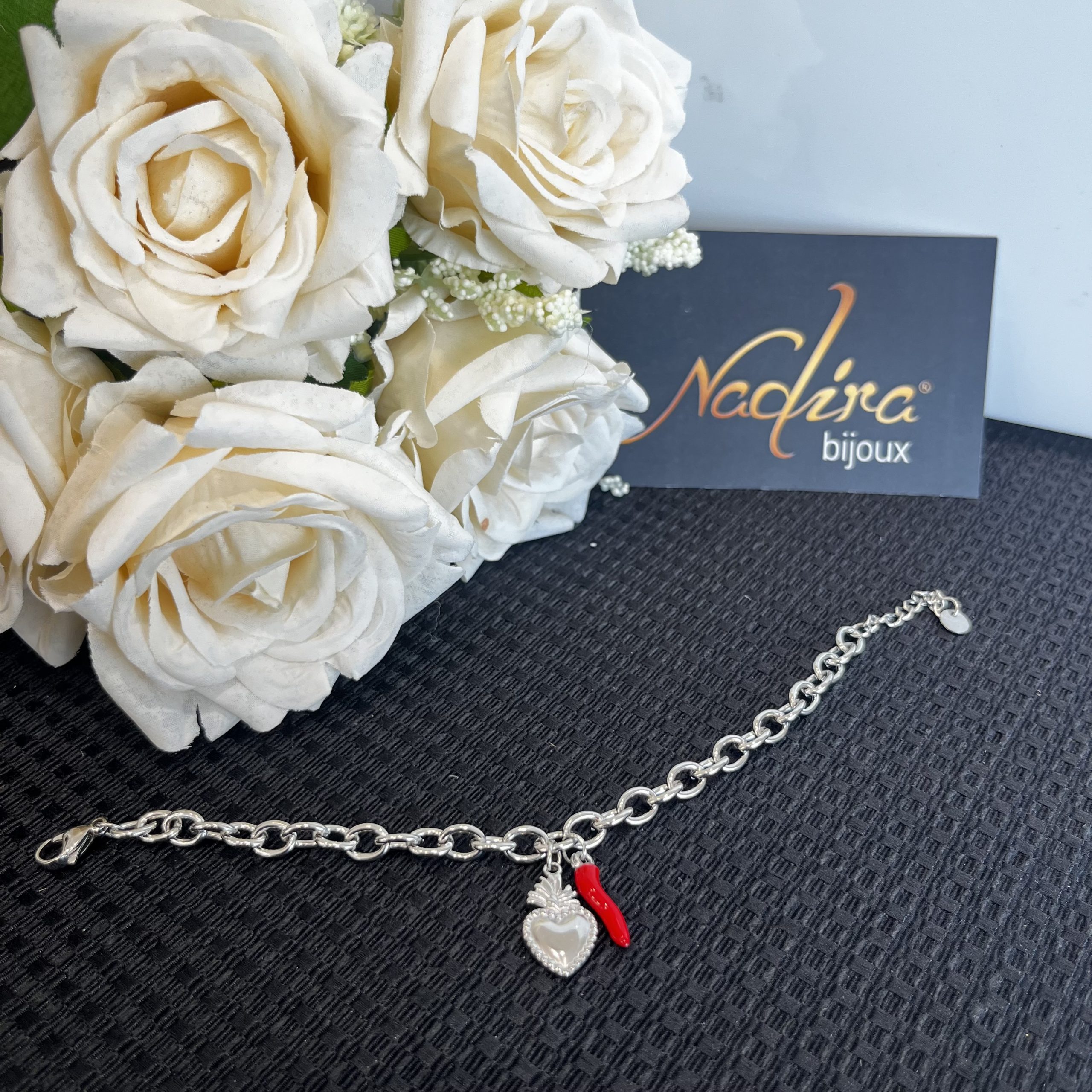 Bracciale catenina tonda con cuore sacro e cornetto.
