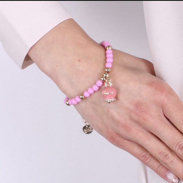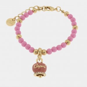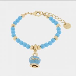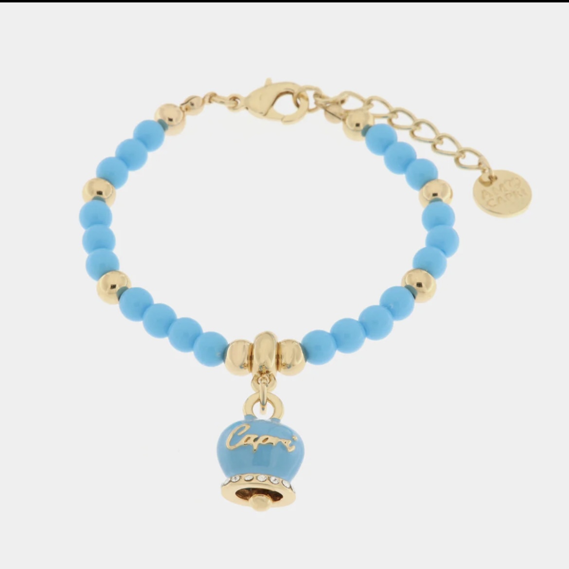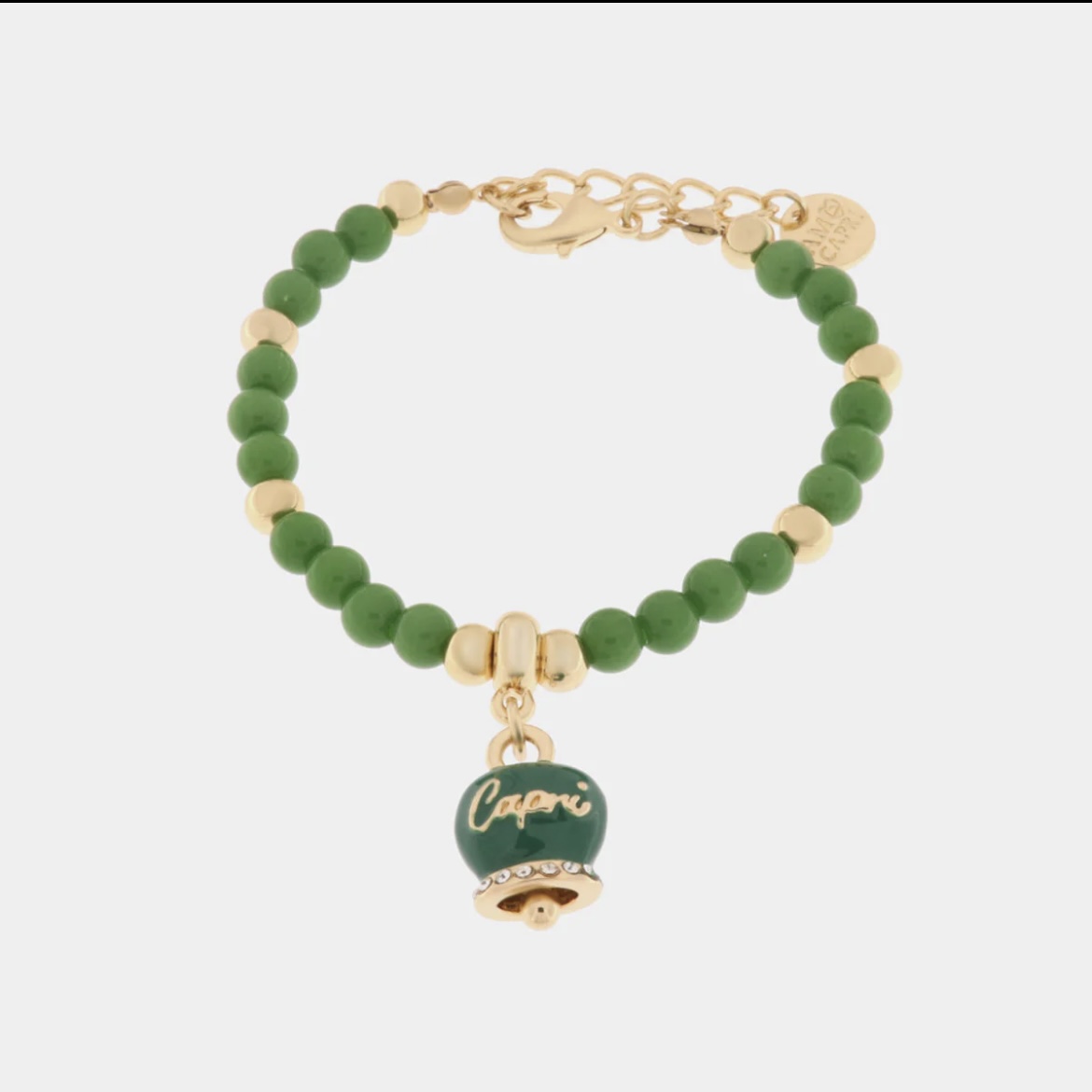Bracciale in metallo con perline colorate e campanella portafortuna con scritta Capri impreziosito con strass.