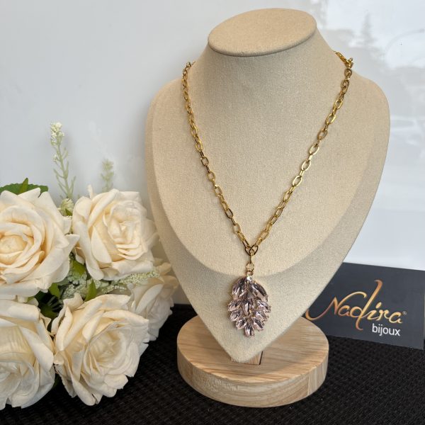 Collana con catenina ovale e ciondolo foglia impreziosito con strass. Lunghezza 60 cm. Realizzata in acciaio 316. Nichel Free.