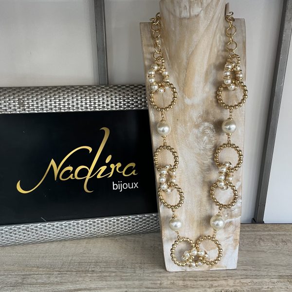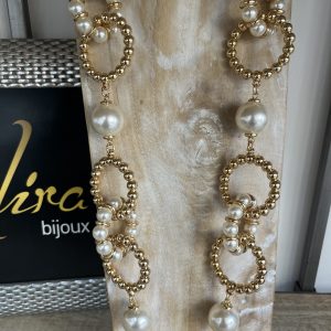 Collana lunga impreziosita con cerchi di perline dorate e perline bianche.