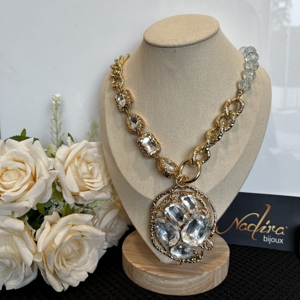 Collana ciondolo tondo con doppia catena impreziosita con strass irregolari.