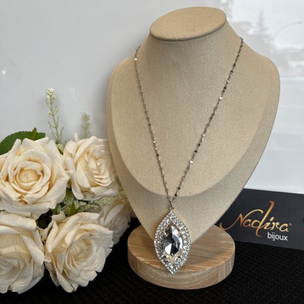 Collana pendente con punto luce centrale impreziosito di strass bianchi. Lunghezza 50 cm. Realizzata in acciaio 316. Nichel Free.
