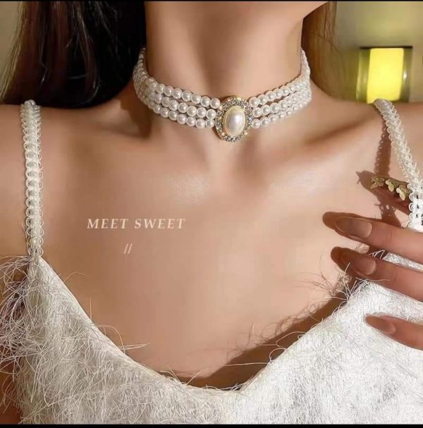 Collarino di perle impreziosito con strass centrali. Lunghezza 40-50cm. Realizzato in acciaio 316 con perle di resina. Nichel free.