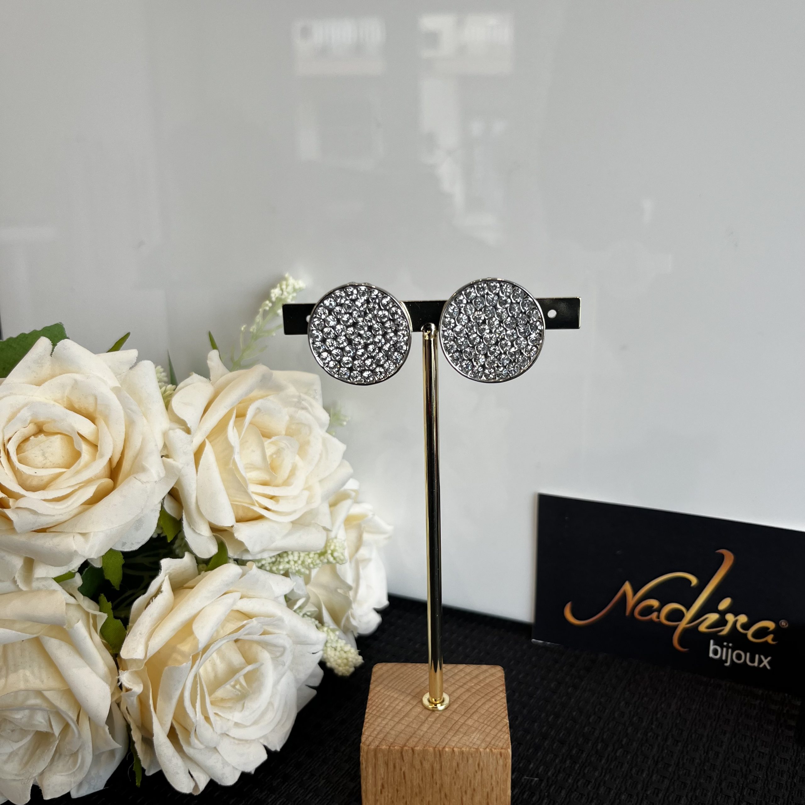 Orecchìni scudo con strass e chiusura con clip. Realizzati in acciaio 316. Nichel Free.